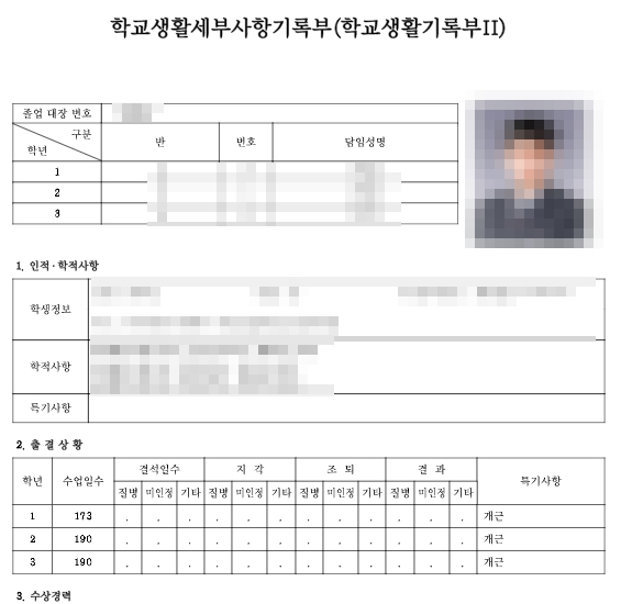 인적 학적사항 , 출결사항, 수상경력, 창의적 체험활동상황, 봉사활동 실적, 교과학습발달 상황, 자유학기 활동상황, 독서활동상황, 행동특성 및 종합의견 등이 기재되어 있습니다.