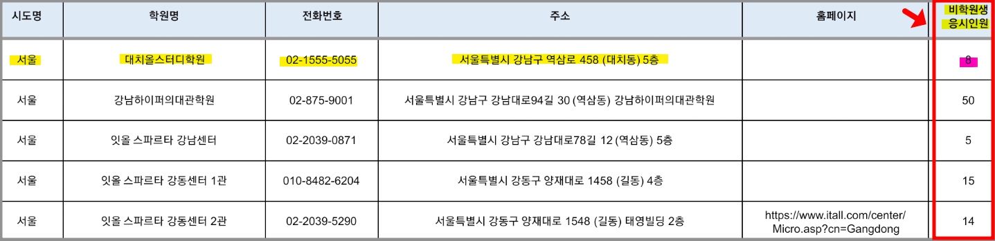 시도명 / 학원명 / 전화번호 / 주소 / 홈페이지/ 비학원생 응시인원 기재되어 있으며,